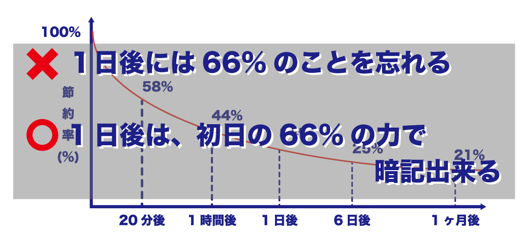 – 1日後には34%しか覚えてない