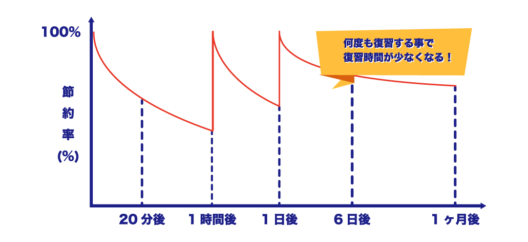 多くの人は「1日で学んだことの66%も忘れてしまう」という部分にのみ注目してしまいがちです。しかし、忘却曲線の本当の意味は、「適切なタイミングで復習すれば、より少ない時間で記憶を取り戻せる」ということなのです。