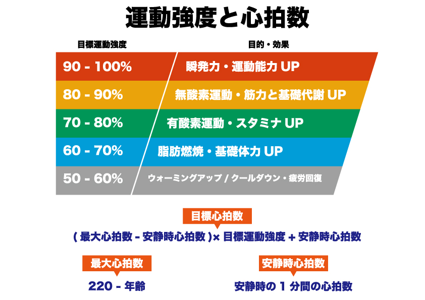 目標心拍数 = [(最大心拍数 – 安静時心拍数) × 目標係数] + 安静時心拍数