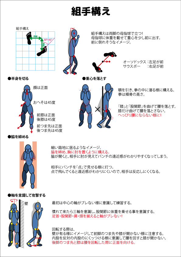格闘技の種類やルール、個人の得意技によって、最適な戦術と構えは変わってきます: